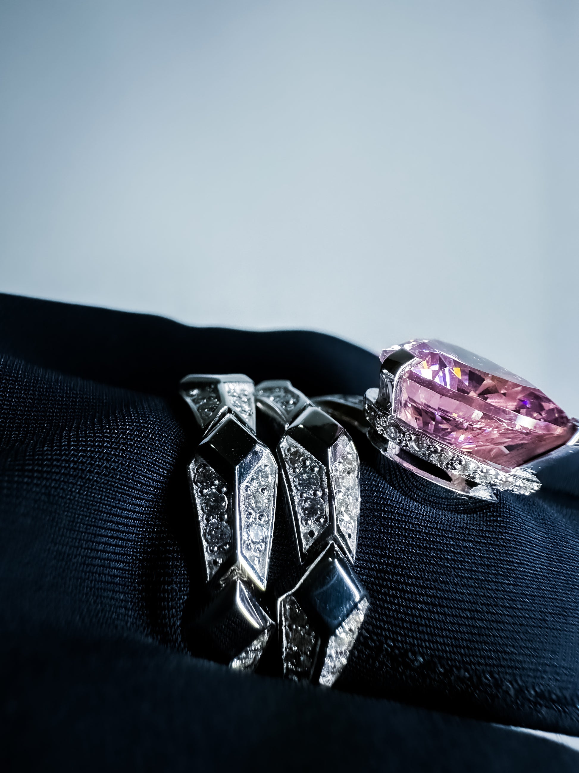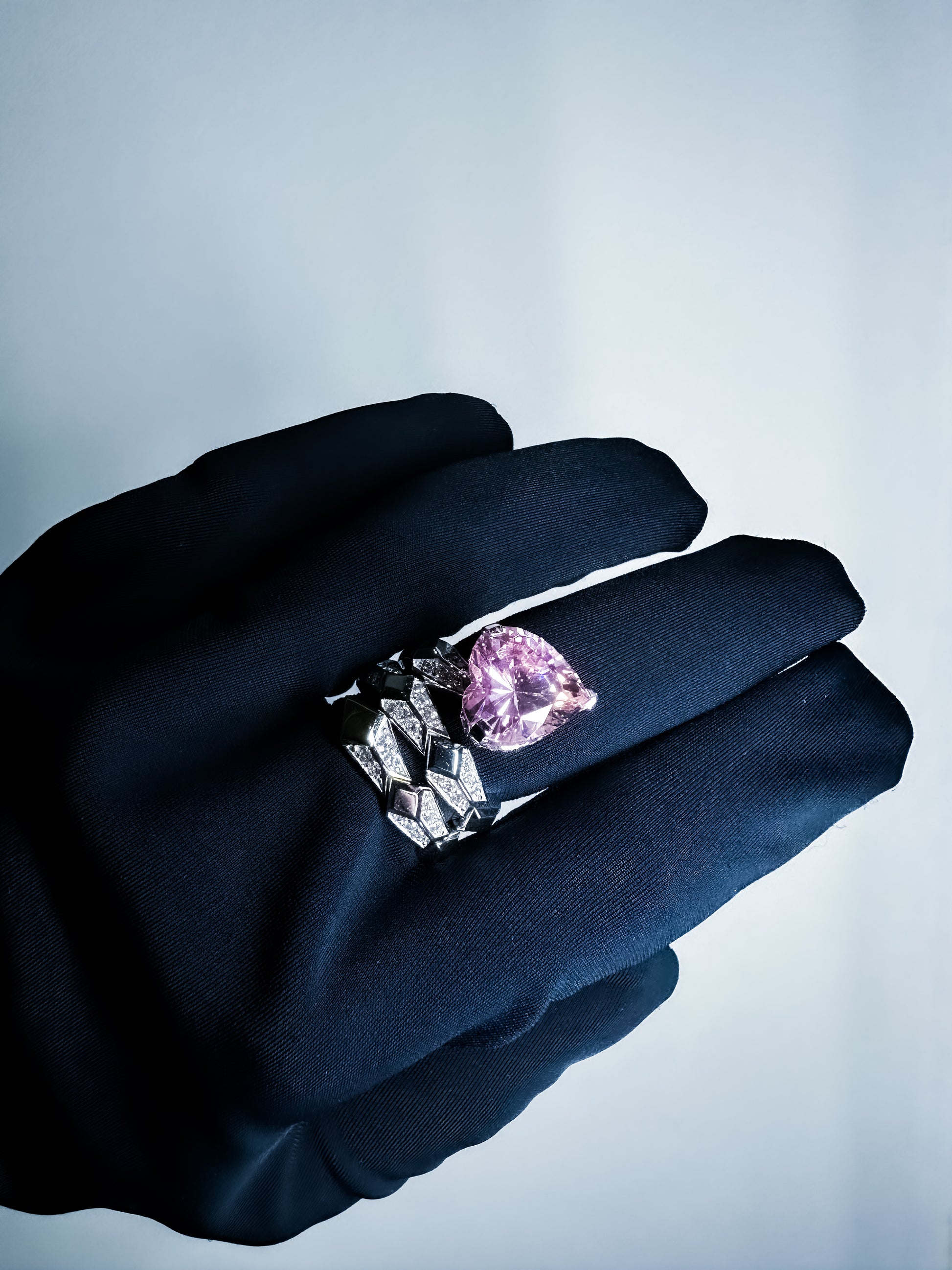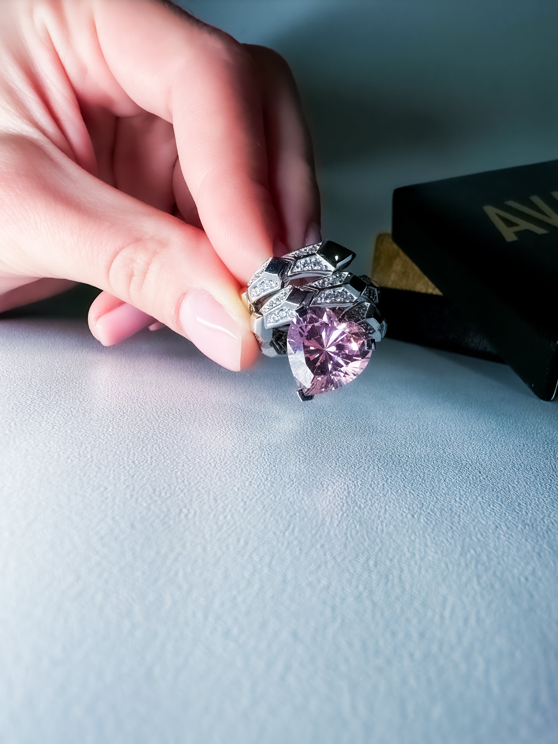 La pierre principale, un magnifique zircon rose en taille coussin, se dresse majestueusement, entouré de pierres étincelantes qui capturent chaque rayon de lumière. Chaque détail a été méticuleusement façonné à la main par nos artisans dans notre atelier, reflet d'un savoir-faire exceptionnel et d'une passion pour l'excellence.