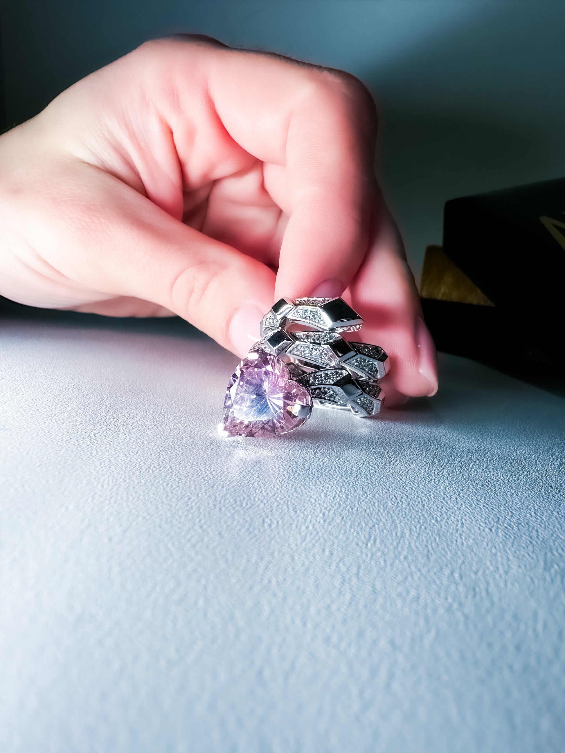 Le chef-d'œuvre se compose d'une chaîne de deux couche en forme de serpent en or Blanc14k, sublimée par des motifs géométriques ainsi qu'un cœur en zircon rose raffinés avec grâce.