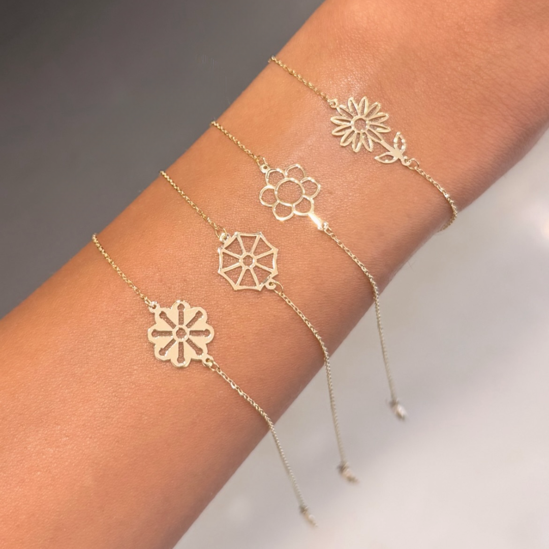 Chaque motif floral évoque un souffle de poésie, un hommage à la nature qui nous entoure et à la féminité qui s’épanouit. Réalisé à la main par nos artisans passionnés, ce bijou précieux se compose d’une chaîne en or jaune 18 carats, d’une longueur délicate approximative de 18 cm, et orné de détails minutieusement travaillés. Les motifs floraux, allant de la fleur simple à la robustesse d’une étoile, apportent une légèreté visuelle et une élégance incomparable, révélant sur votre poignet l’artisanat d’exception, issu de notre atelier.